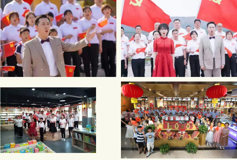 随着熟悉的音符在党旗下飘扬,活动现场来往的市民和群众应声而歌,纷纷扬起手中的红色旗帜随着歌声挥动,用深沉的热爱唱出爱党奋进的力量。这次快闪活动是全体新华人向党的深情表白以经典歌曲讴歌党的百年风华、礼赞新时代新中国,以嘹亮歌声彰显新华书店风采、表达爱党爱国赤子情怀。