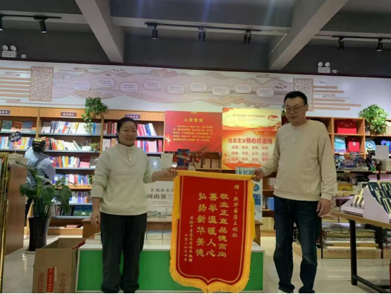10月18日,市民读者薛女士来到修武县店卖场,将一面绣有“敬业正直品德高尚 善举温暖人心 弘扬新华美德”的锦旗赠予县店员工王林征,并再三对其表达感激之情。
