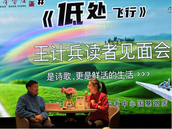 活动现场,王计兵还展示了自己诗集《低处飞行》,并深情朗诵了书中代表作。他的诗歌语言质朴而深情,让在场的每一个人都感受到了诗歌的力量和美好。此外,他还与读者们进行了互动交流,回答了他们关于诗歌创作、人生哲学等方面的问题。其中谈到关于子女教育的问题时,王老师表示:“只要孩子付出了自己最大的努力,做到不后悔就是最好的结果。”