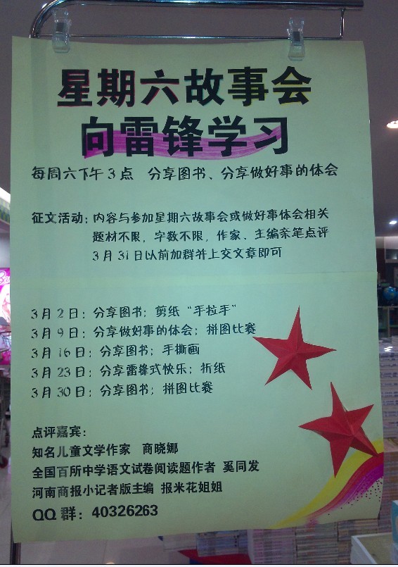伴随着春节长假的远去,三月份如期而至,同时该月又是学雷锋月,郑州市店为大力弘扬雷锋精神,充分利用自身营销品牌——“星期六故事会”这一平台,开展为期一个月的“向雷锋学习”主题活动。